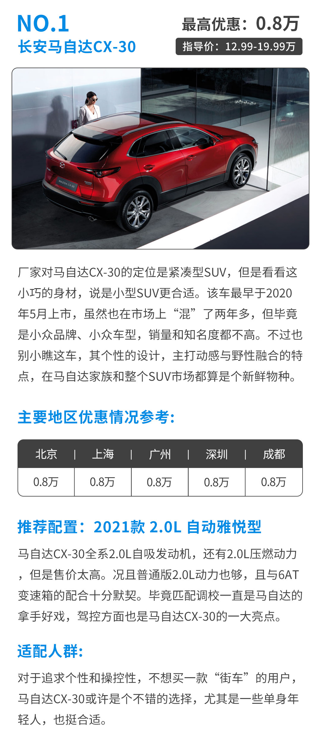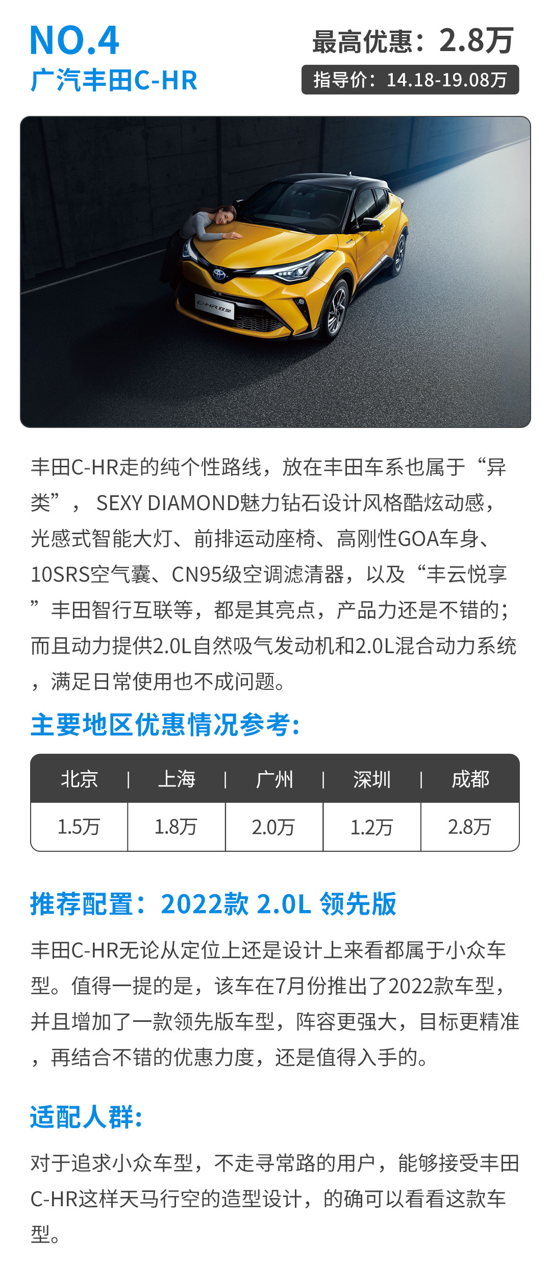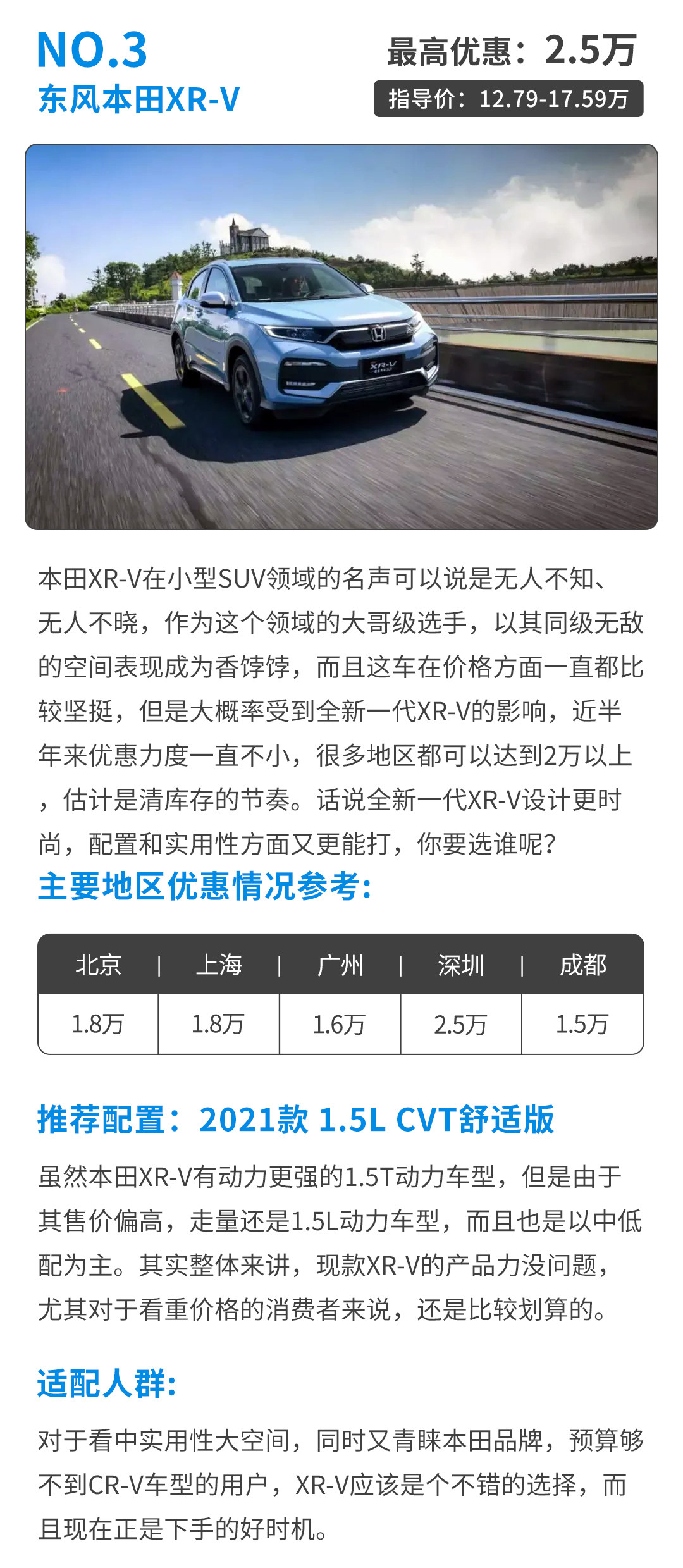 不过,以往小型SUV中,合资品牌中的日系产品一向价格坚挺,虽然后期保值率也更高,但对很多人来讲不算友好;但是在市场竞争越来越激烈的背景下,再加上国产新能源车型的冲击,如今合资SUV也都变得十分亲民,甚至日系品牌也有了相对不错的优惠力度。今天我们就来看几款当前市面上比较热门的合资小型SUV行情。