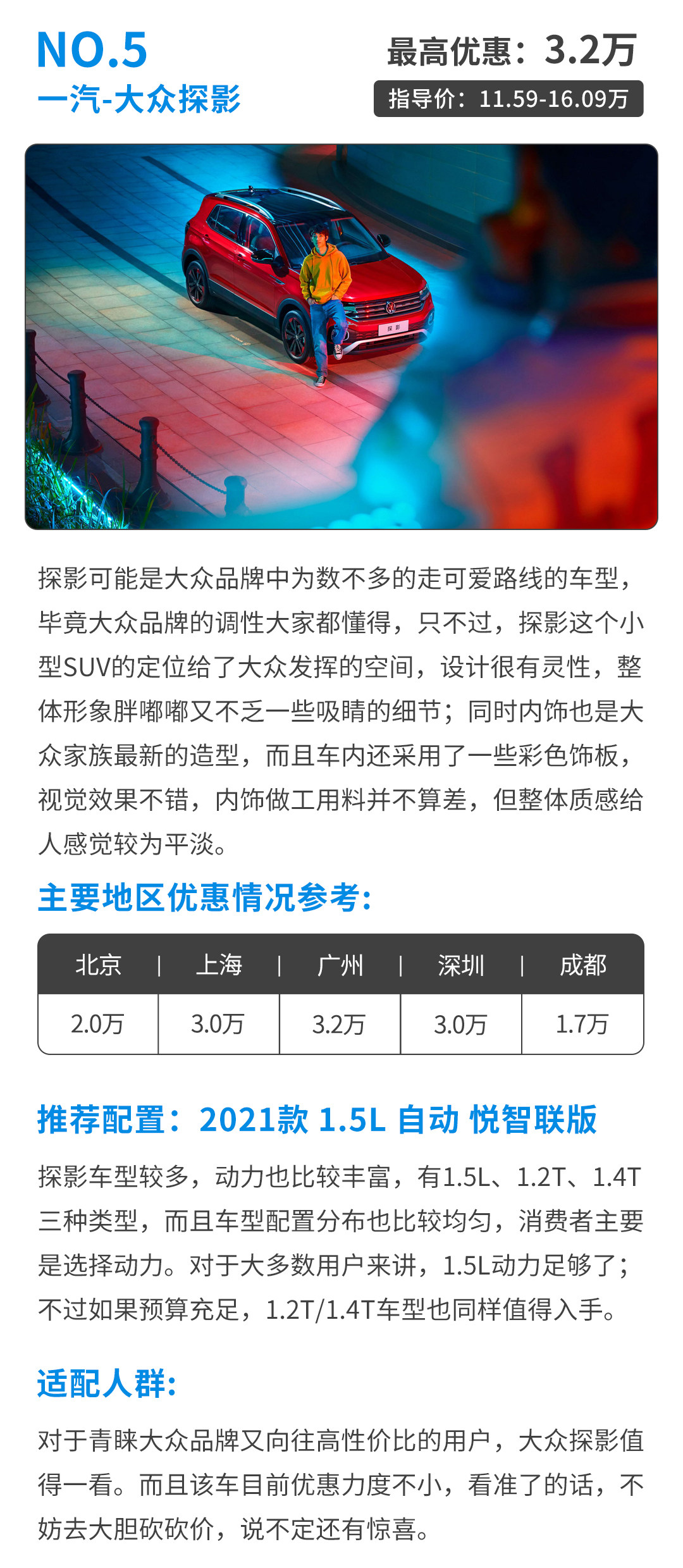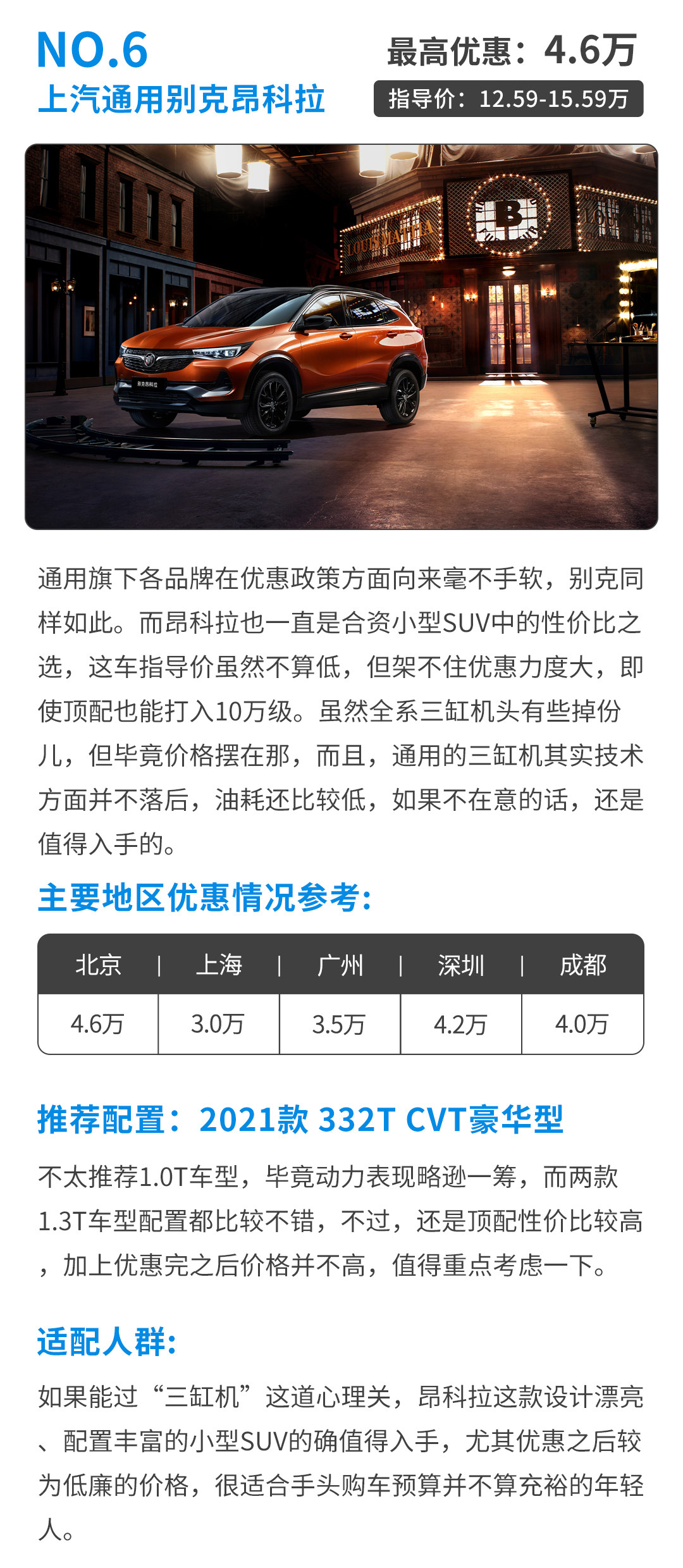 小型SUV市场如今动静不大,不过,也不要以为局面已经稳定,其实大家都在暗自较劲,优惠政策也是水涨船高,甚至是一向价格比较坚挺的日系品牌,也祭出不错的优惠力度,确实是一个“捡漏儿”的好时机;而大众探影和别克昂科拉的优惠力度向来都是顶级的,也能凭此得到不少用户的青睐。如果对这几款小型SUV感兴趣的话,不妨到当地4S具体了解一番。
