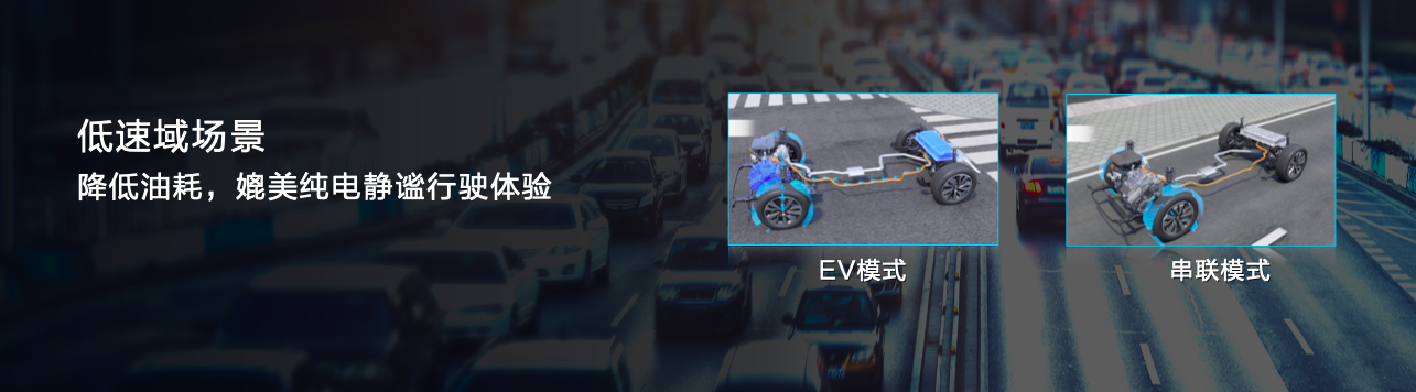 在高速超车及爬坡场景,通过动力挡直驱降低发动机负荷,使发动机工作在最优经济区,换挡、换模过程中,通过发电机辅助调速和驱动电机扭矩补偿,保证切换过程无动力中断、无冲击,真正满足用户全场景的用车需求。