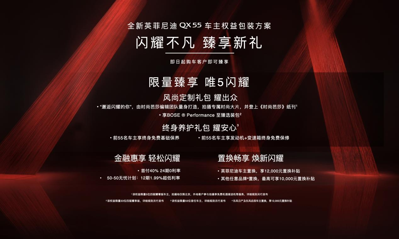 与此同时,英菲尼迪还带来了一系列重磅的车主权益。即日起购买全新英菲尼迪QX55的指定车型,就有机会享受限量风尚定制礼包。其中,既包含时尚芭莎编辑团队量身打造、拍摄的专属时尚大片,登上《时尚芭莎》纸刊秀出你的魅力;也有Bose® Performance 至臻选装包。为了让客户更安心,英菲尼迪还限量推出了终身免费基础保养和发动机+变速箱终身免费保修的终身养护礼包。此外,全新英菲尼迪QX55更有首付40% ,24期0利率、50-50无忧计划,以及至高12,000元置换补贴等一系列金融置换豪礼。