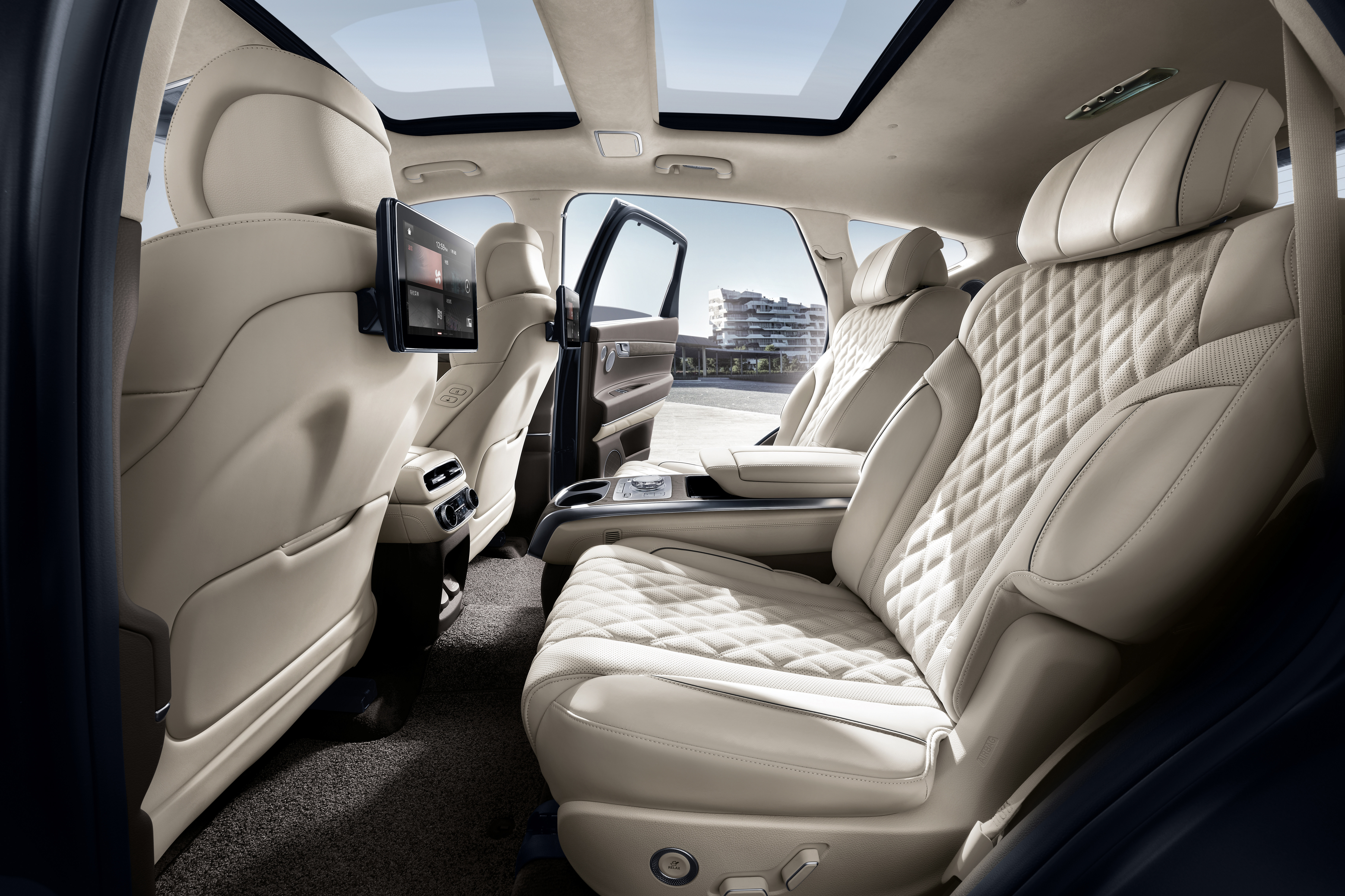 第二排座椅间的中控台集成温度控制、无线手机充电与后排娱乐系统等功能,专属氛围灯为乘坐体验增添了个性化的沉浸式元素。位于第一排椅背后方的双触摸屏则可提供丰富的影音娱乐功能。