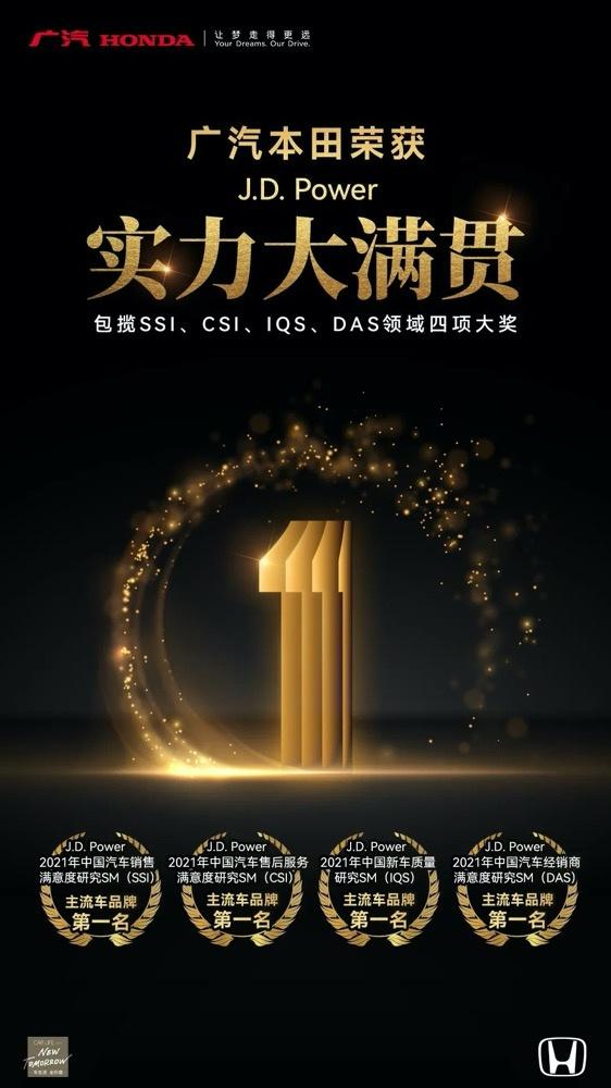 上述种种优化提升,助力广汽本田在J.D. Power榜单中,取得五年三次第1、一次第2的佳绩。特别是去年,广汽本田在2021年中国汽车销售满意度研究SM(SSI)、2021年中国汽车售后服务满意度研究SM(CSI)、2021年中国新车质量研究SM(IQS)、2021年中国汽车经销商满意度研究SM(DAS)四个单项中均位列主流车品牌No.1,在所有厂商中表现最为亮眼。