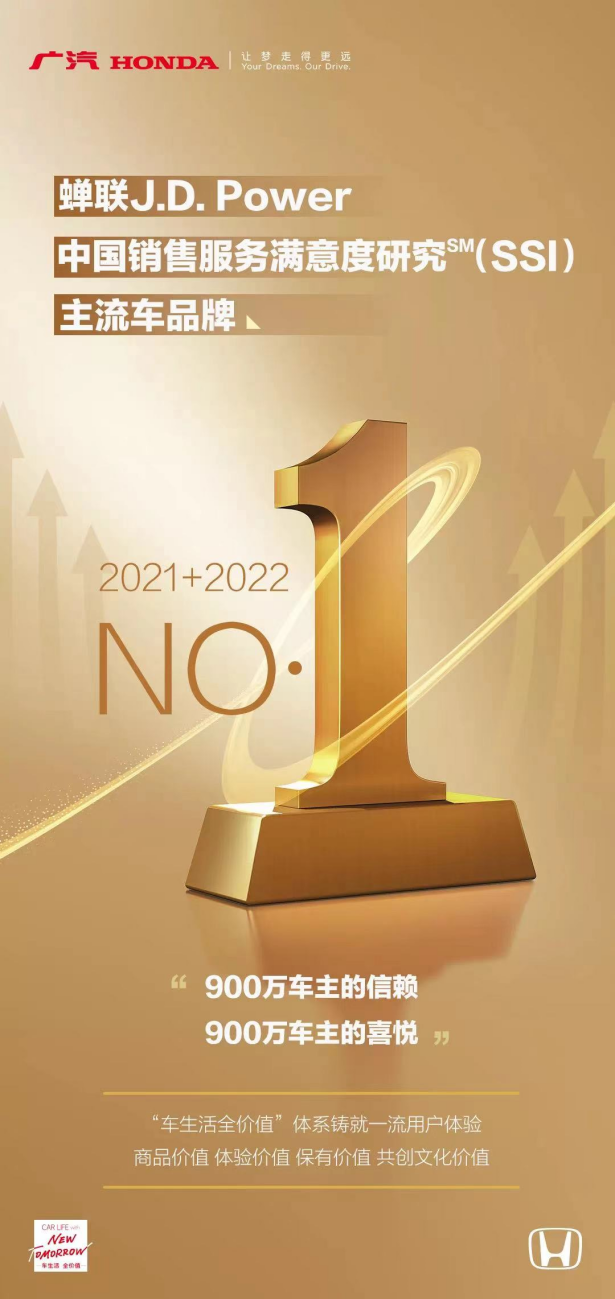日前,J.D. Power(君迪)发布了《2022中国销售服务满意度研究(SSI)调查》报告,广汽本田以759分的高分,蝉联主流车细分市场销售满意度No.1,这也是广汽本田近5年内第3次夺得J.D. Power SSI主流车细分市场销售满意度冠军,突显广汽本田车生活全价值强大体系力。