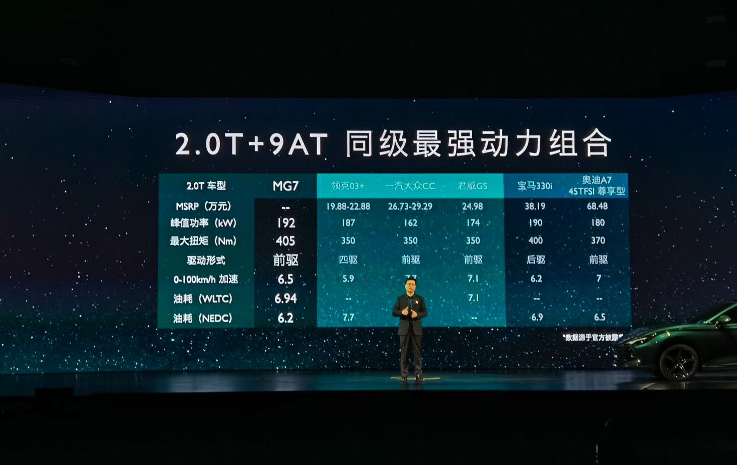 根据上汽的说法,黑标所代表的极致程度,是指产品力至少要进入第一阵营,因此MG 7搭载了上汽全新一代动力组合2.0T+9AT,最大功率192kW,峰值扭矩405N·m,百公里最快加速6.5秒。