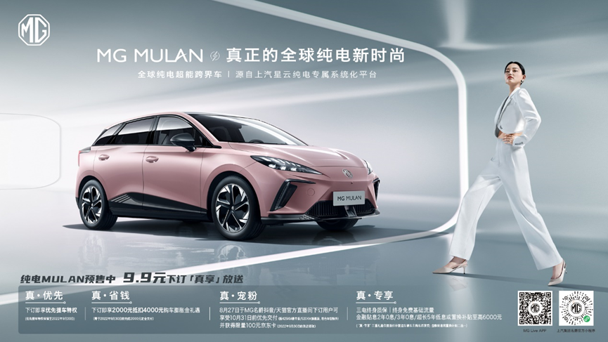 无论是驾控性能、安全品质,还是造型设计,MG都满足了当下全球消费者日益挑剔的“味蕾”,带给用户完美纯电出行体验。蓄势以待,志在四海,作为MG品牌投向全球市场的重磅产品,MG MULAN将引领“中国智造”征战全球。截止目前MG MULAN全球预售订单破2万,热销全球,未来还将带来精彩表现,敬请期待!