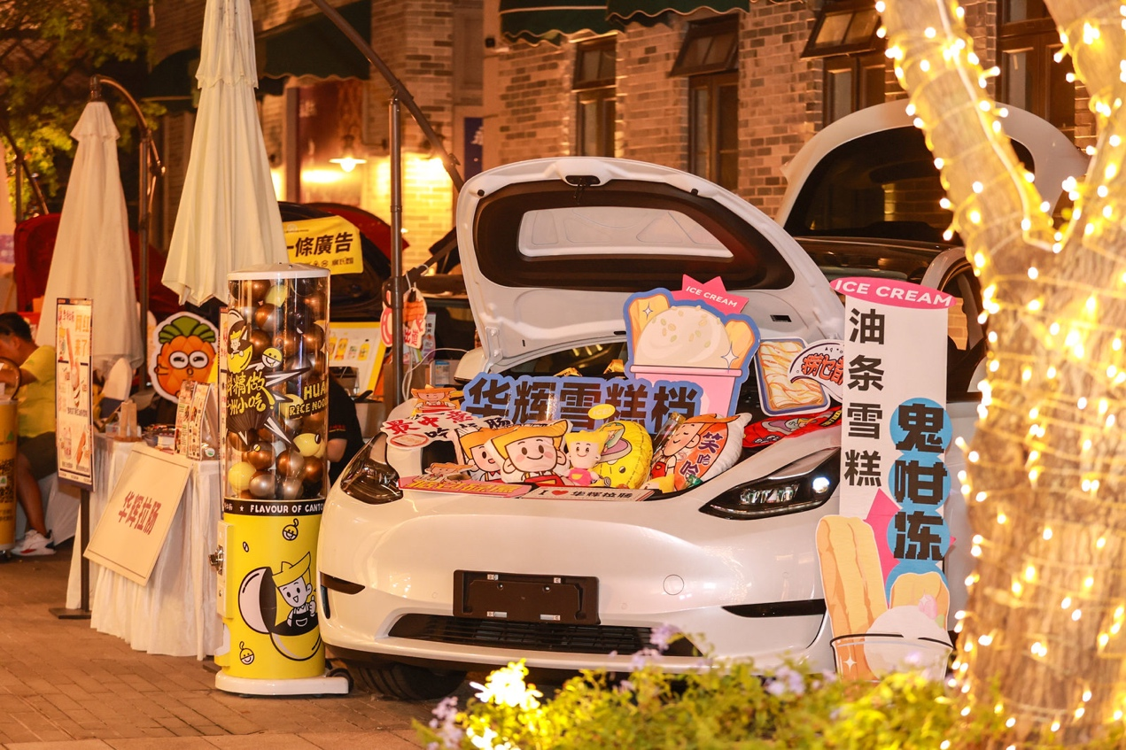 在烟火夜市广州站现场,多辆特斯拉齐齐打开车尾箱,在氛围灯的笼罩下,组成了最具人气的车尾箱集市,更成为夜幕降临后,广州市民携老扶幼、呼朋唤友漫步其间的烟火人间。