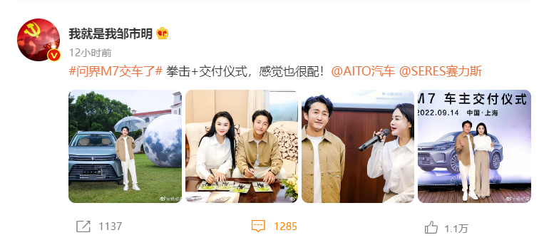 9月14日,问界M7车主交付活动在上海隆重举行,奥运冠军“中国拳王”邹市明和妻子冉莹颖也出现在本次交车仪式现场,以问界M7新车主的身份喜提爱车。