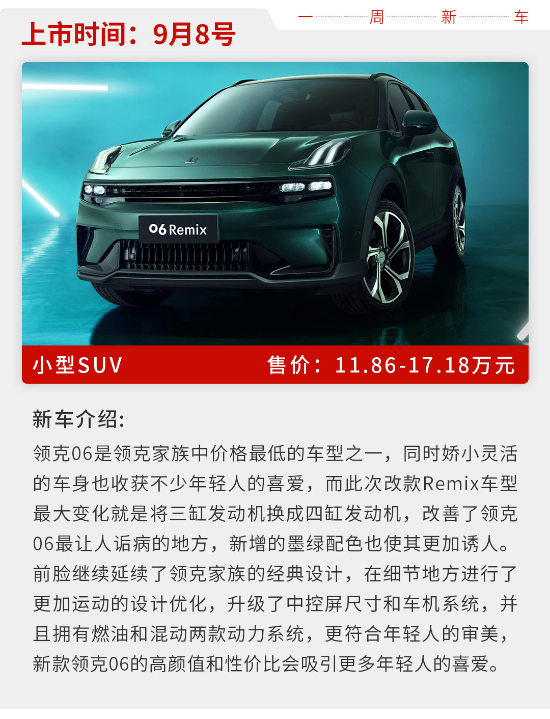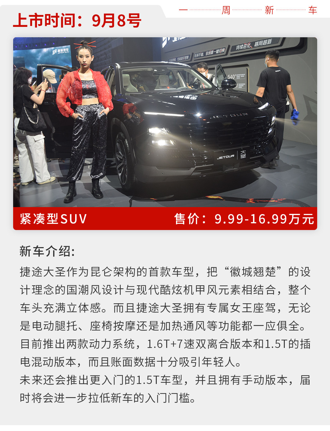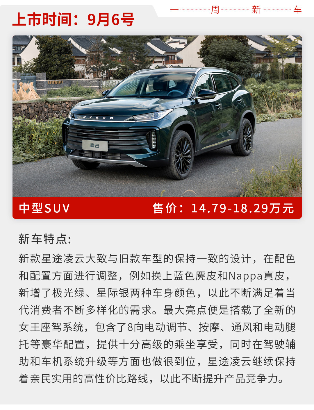 上周正值中秋来临,有不少车企趁着佳节来临之际上市他们旗下的新款车型,给中秋这样的佳节添加更喜庆的气氛,同时也能吸引一波准备买车的用户,接下来就一起去看看上周上市的新车吧。