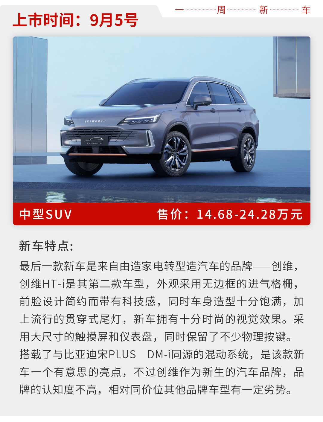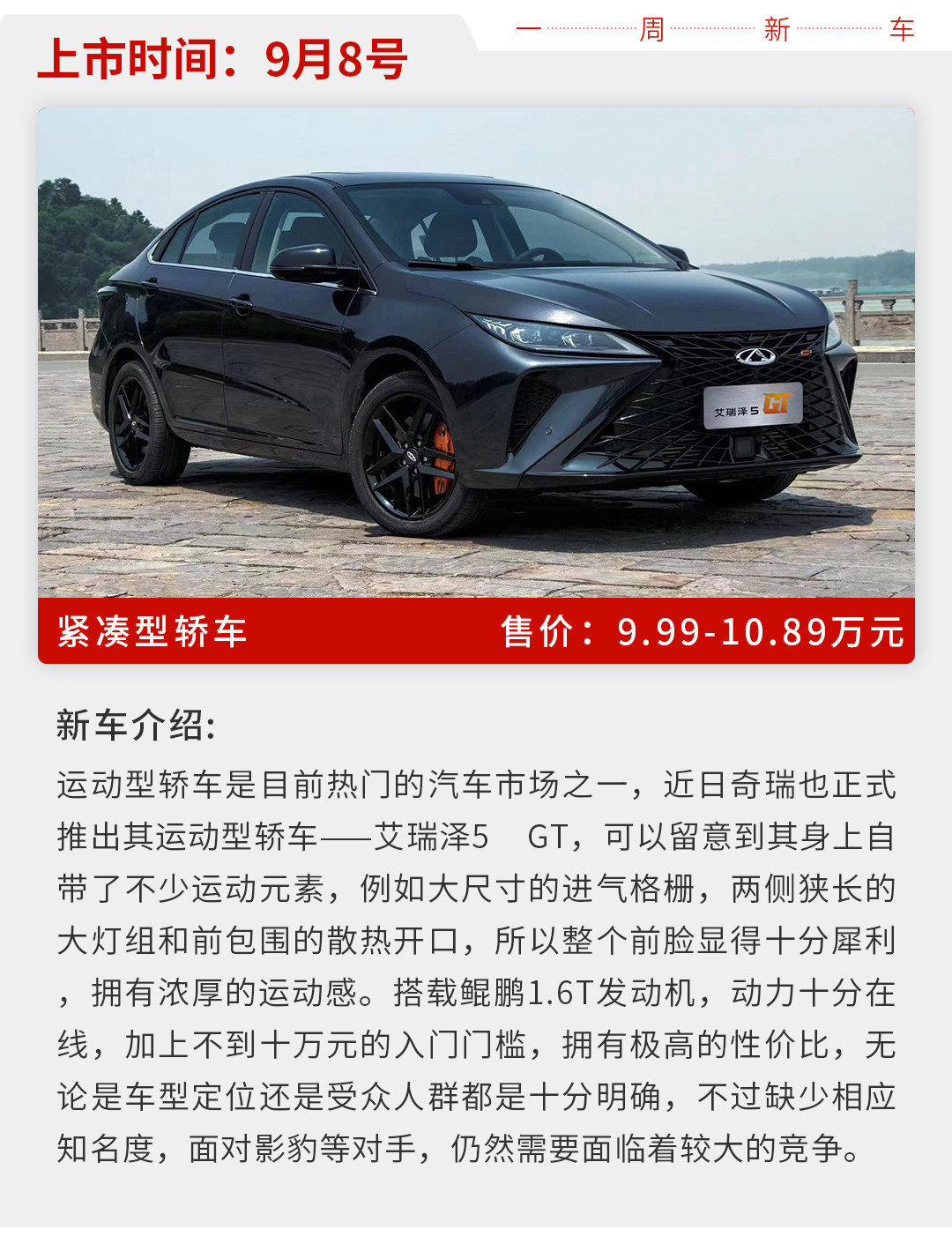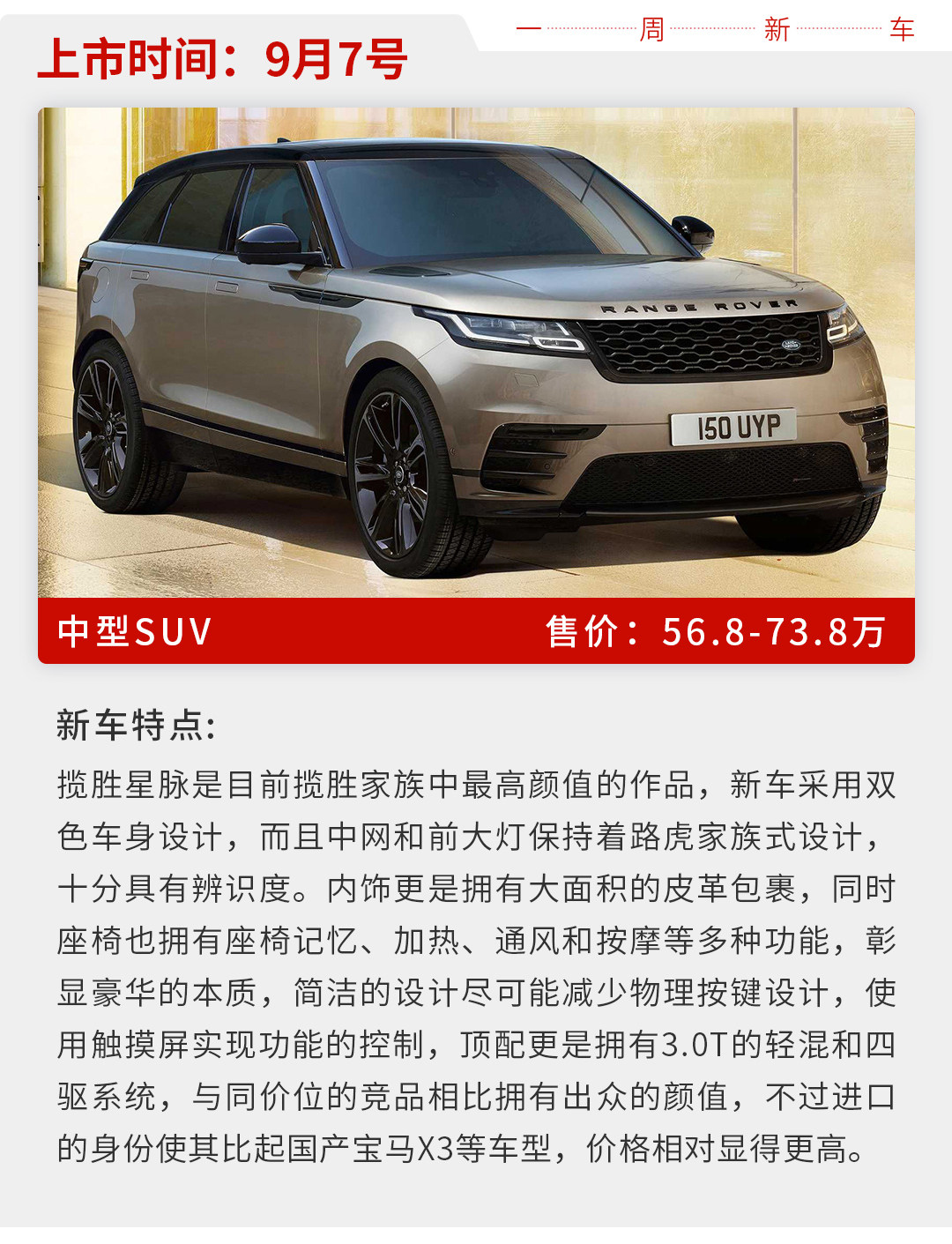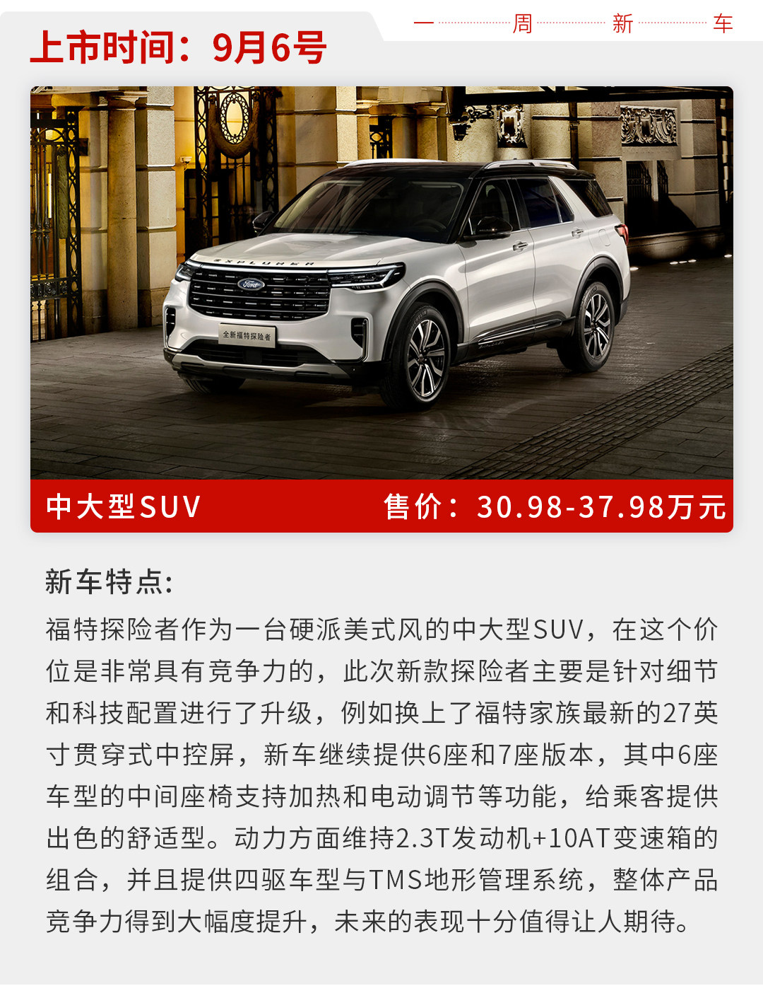 上周正值中秋来临,有不少车企趁着佳节来临之际上市他们旗下的新款车型,给中秋这样的佳节添加更喜庆的气氛,同时也能吸引一波准备买车的用户,接下来就一起去看看上周上市的新车吧。