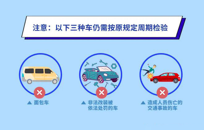 不过!需注意的是,非法改装车辆(被处罚过的)、造成人员伤亡的交通事故车辆,以及面包车,这三类车型是无法享受以上新政福利,仍需要根据原定周期年检政策进行上线检验。
