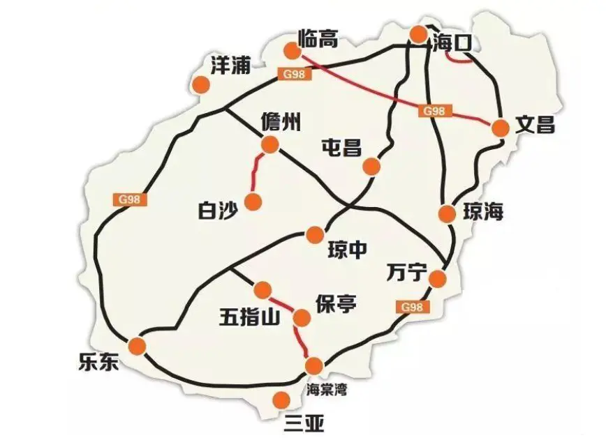 在公路网络方面,我们从海南省最北端的海口市到最南端的三亚市仅有300km左右的车程。即便通过海南环岛高速公路绕岛一周,全程也只有612km。