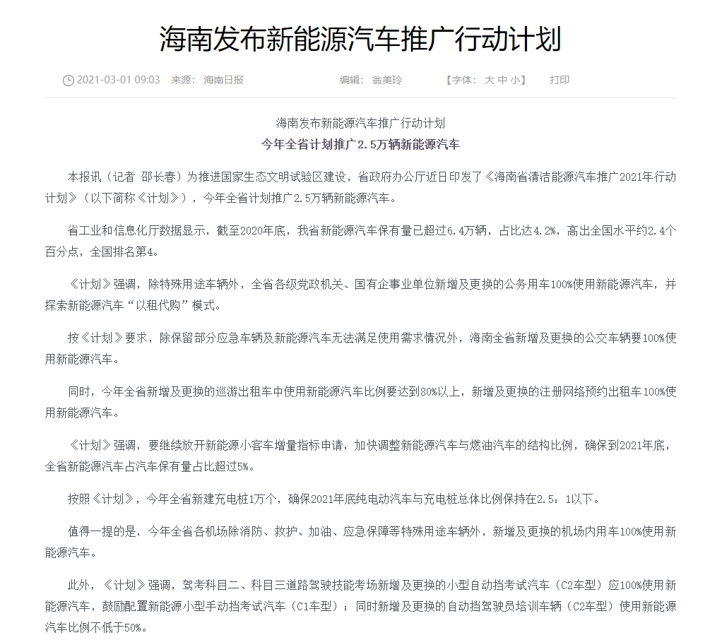 为了推行《发展规划》,海南省人民政府办公厅又在去年3月份印发了《海南省清洁能源汽车推广2021年行动计划》。
