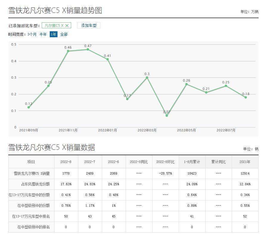 另外,在国内市场,凡尔赛C5 X在同级车型里表现只能说凑合,尽管造型出众、配置丰富、机械素质过硬、售价亲民,但奈何雪铁龙只是个小众品牌,在广大消费者心中并没有留下深刻的印象,加上经销商网络不够齐全,很多人想看车、体验车都没有机会,因此销量一直表现平淡。