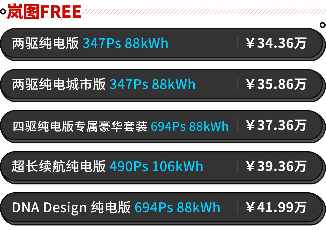 岚图FREE的入门价格为34.36万,虽然动力比G9两驱版好一点,但没有高配的空气悬架,88kWh的电池也比G9小一些。