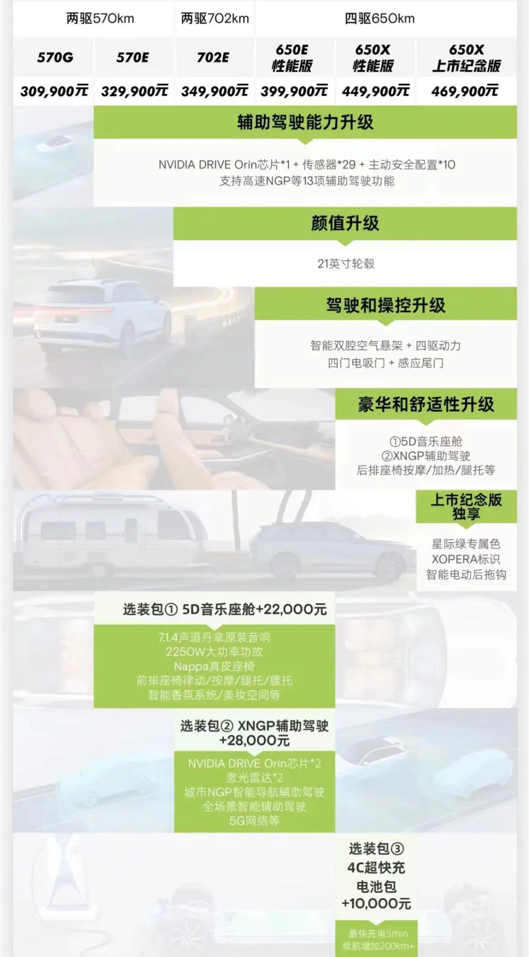 当然为了价格数字更好看一些,G9的激光雷达、5D座舱、4C超快充电池包就变成选装项目,如果不需要的用户则可以便宜1-2万。