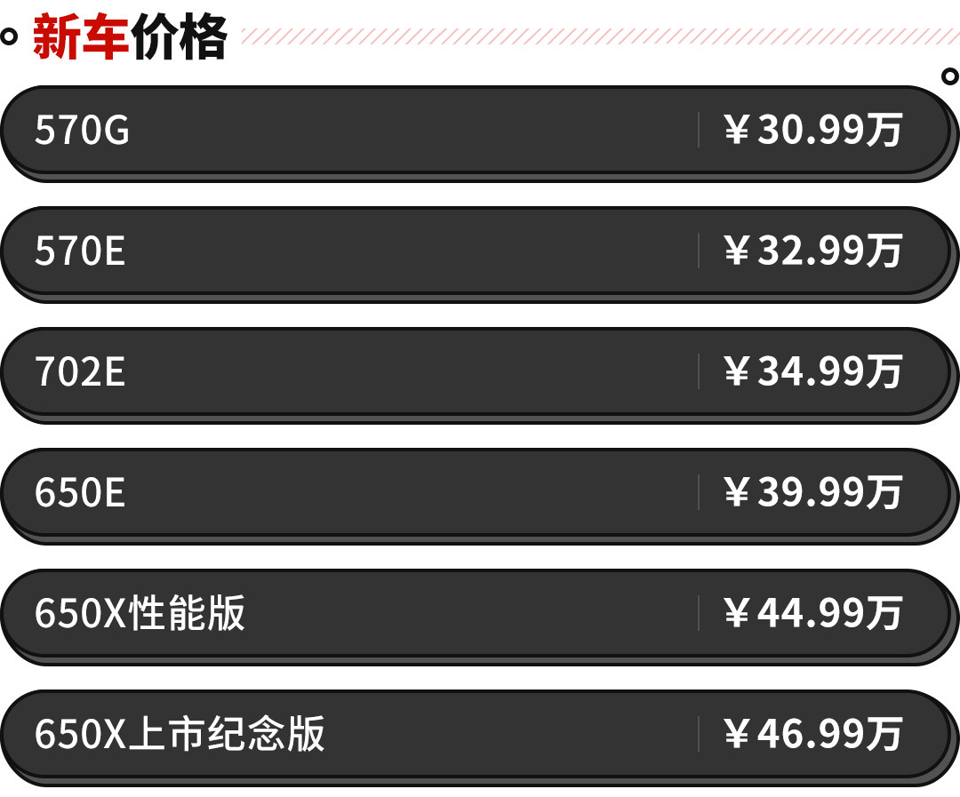 电池容量570G、570E版本为78.2kWh的磷酸铁锂电池,其余是98kWh的三元锂电池。四驱拥有碳化硅三合一驱动技术来降低能耗,CLTC续航650km,而两驱根据电池大小分别为570km和702km。