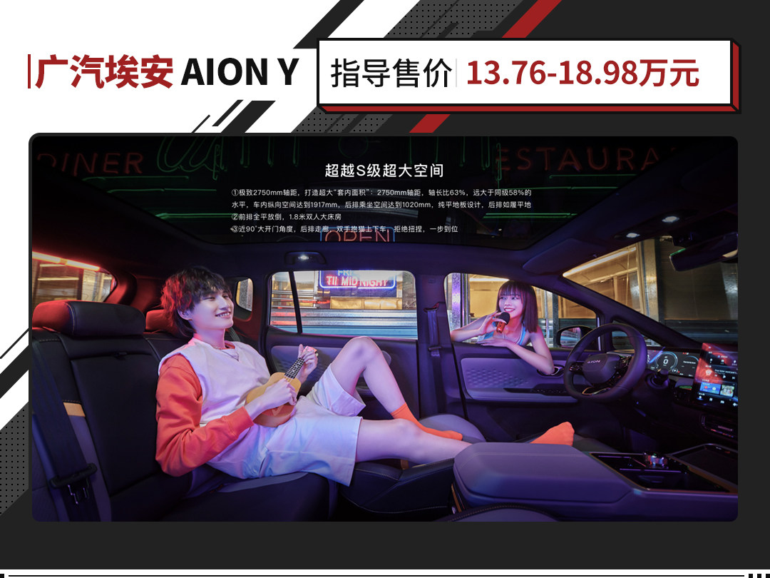 AION Y的造型有点不走寻常路,虽然定位SUV,但偏向MPV的设计看上去有些特立独行,尤其是大角度倾斜的A柱,而且几乎全部的轴距都给了座舱,这也让其以并不算出众的车身尺寸却拥有相当不错的空间体验,尤其是后排非常宽敞。内饰布局比较常规,不过也采用了一些撞色以及压花等元素,来营造年轻活泼的氛围;同时,做工用料、科技属性都不错,各方面功能配置也足够全面,日常使用很方便。