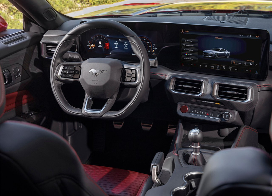 相比外观,Mustang的内饰则采用了新的设计语言,最显眼的就是12.4英寸全液晶仪表+13.2英寸中控组成的双联屏,不过似乎与美式肌肉车的身份不太搭。