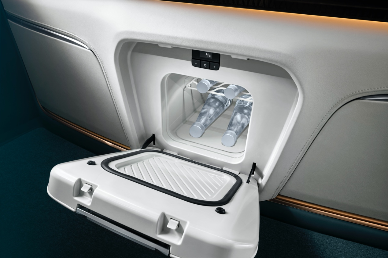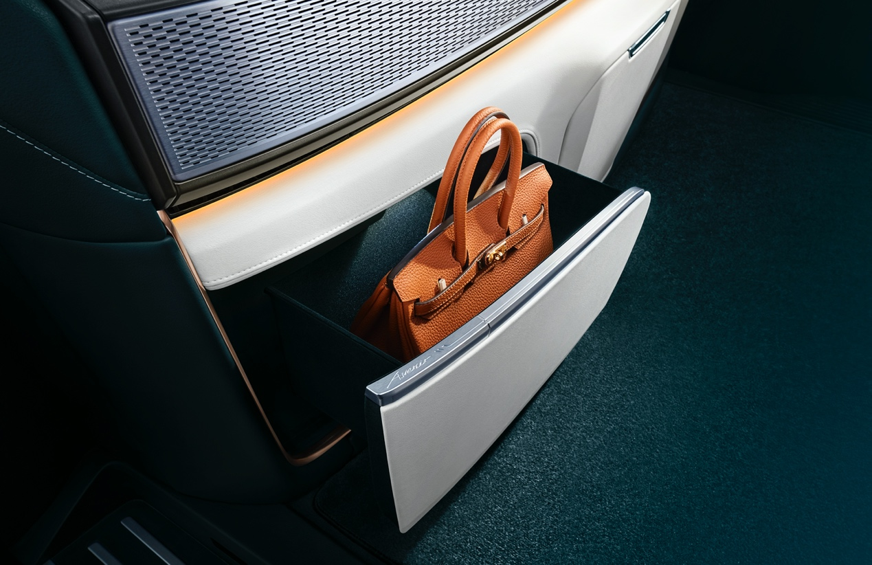 豪华智能幕墙的最下部两侧设计有大容量抽屉式储物箱,其内部使用植绒覆盖,在保护贵重物品的同时也避免了行驶途中因物品振动而发出的噪音。