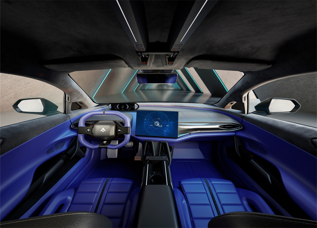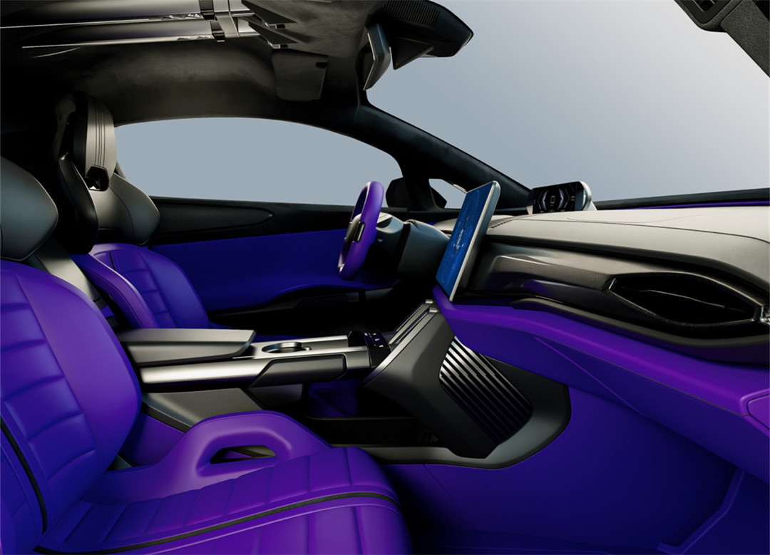内饰采用了电光渐变色,材质用的是碳纤维、纯植物鞣制环保真皮、生物基仿麂皮和环保纱线来3D立体编织。
