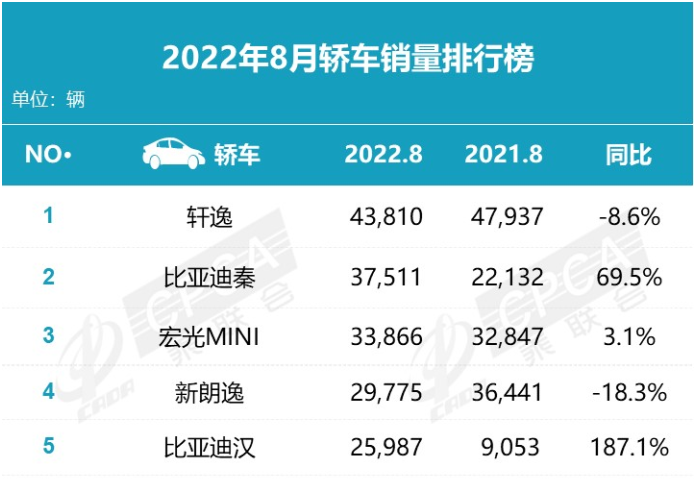 在2022年8月份轿车销量排行榜上,秦PLUS的销量成绩仅次于久经沙场的日产轩逸。