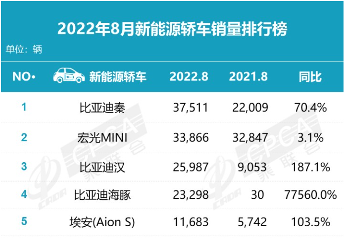 在8月份新能源紧凑级轿车销量排行榜中,位列第二的Aion S销量仅有11683辆,比之秦PLUS有着多达3倍的销量差距。