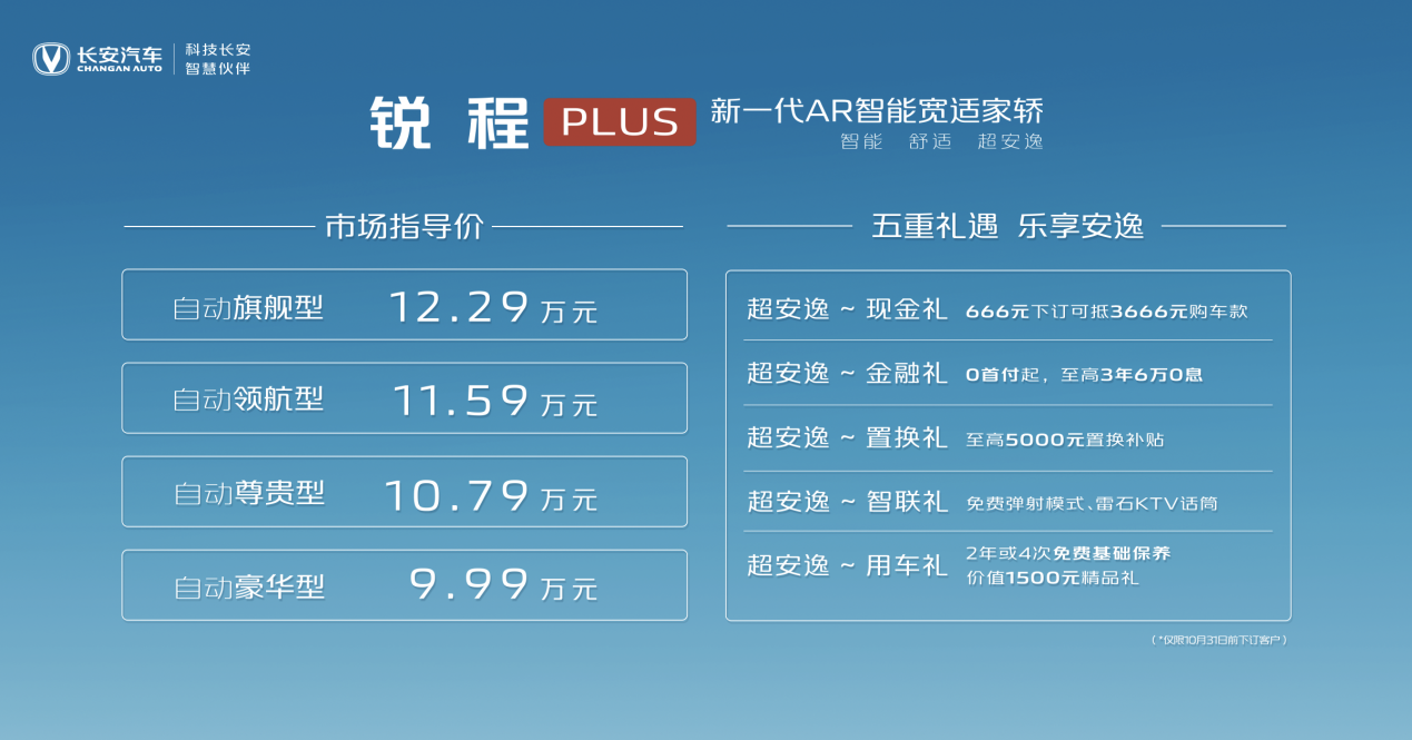 9月28日,长安汽车“启新程 超安逸”锐程PLUS上市发布会在线举行。在全网媒体及众多网友关注下,“新一代AR智能宽适家轿”——锐程PLUS正式上市!新车共推出4款车型,以AR-HUD增强现实抬头显示、540°高清全景影像系统、蓝鲸新一代NE1.5T高效动力组合、一体式零压感座椅等尖点配置,为用户带来“超安逸”价值产品体验,官方指导价9.99-12.29万元。