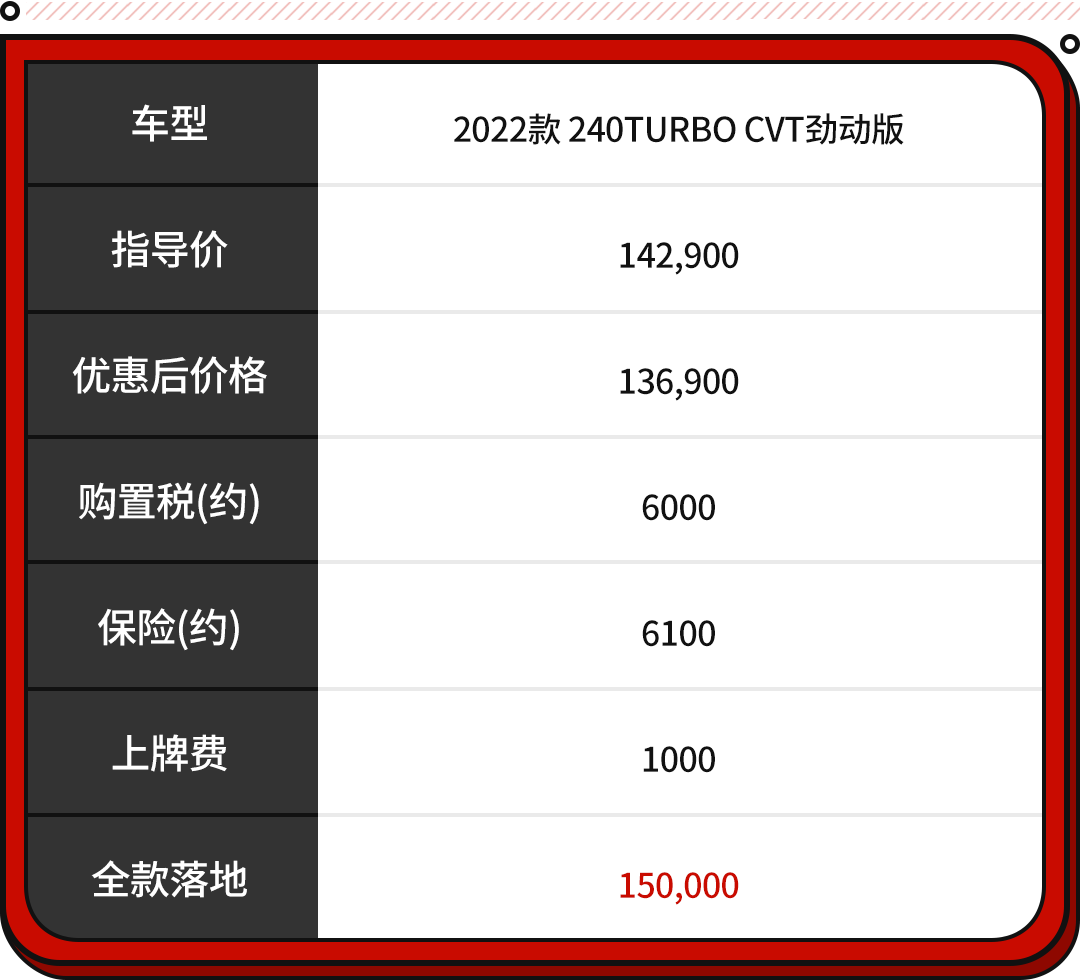 如果对于外观无特殊需求的,仅仅用于家庭实用,购买1.5T高功率入门版车型最合适,指导价14.29万元,目前优惠6000元左右,算是购置税6058元,商业保险+交强险6200元,上牌费1000元,全款落地刚好在15万元;如果按30%分期三年来算,首付5.42万元,每月还款2861元,利息为7166元。