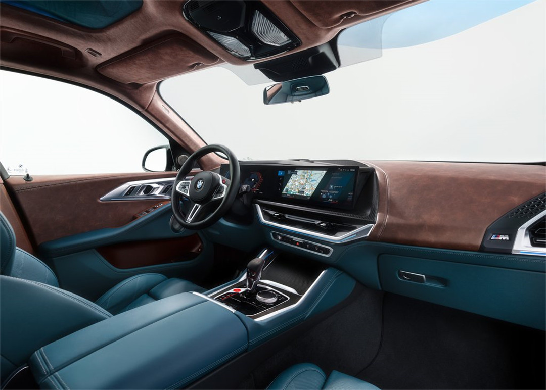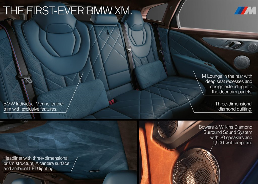 车内主要是通过用料、配色、图案来突出XM与众不同的豪华感。颜色提供了此前宝马车型上从未见过的蓝,中控台有M车型标志性的碳纤维来点缀,缝线的颜色更加丰富,门板和顶棚大还有面积的皮质包覆。