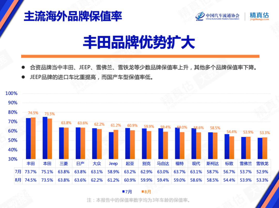 有意思的是,部分小众品牌保值率反而有所增长,比如JEEP这支品牌,保值率为58.9%,环比增长了2.3%。