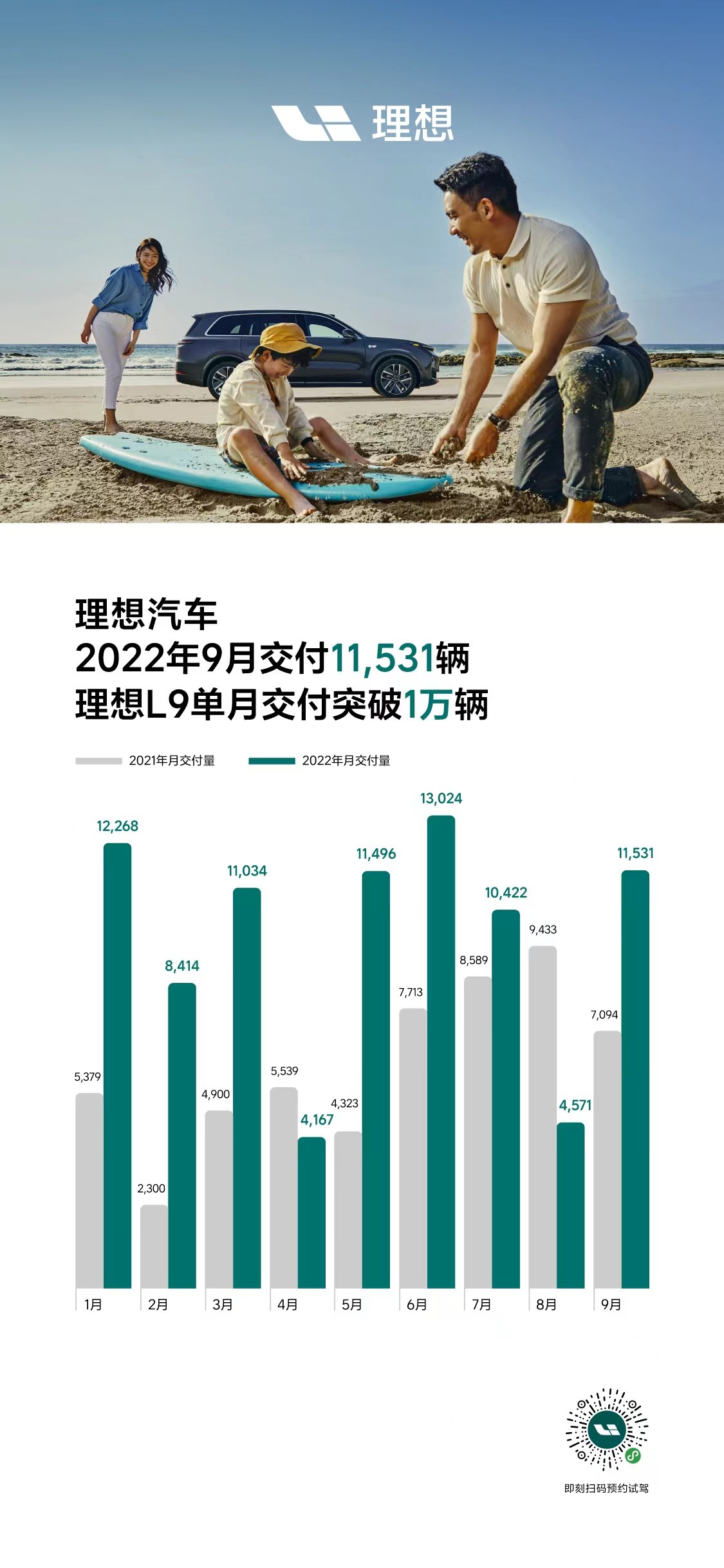 2022年10月1日,理想汽车公布2022年9月交付数据。2022年9月,理想汽车共交付新车11,531辆,同比增长62.5%。其中,家庭智能旗舰六座SUV理想L9,在首个完整月交付10,123辆,是首个单月交付量过万且售价在40万以上的中国品牌车型。第三季度累计交付26,524辆,同比2021年第三季度增长5.6%。截止到2022年9月30日,理想汽车累计交付量为211,015辆。