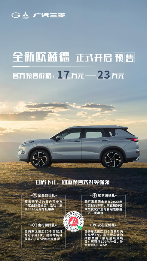 出色的产品实力加上可靠的产品品质,再结合其17万元-23万元的预售价格,很明显它在同级车型中拥有不俗的竞争力。如今,全新欧蓝德预售活动已正式开启,并将在不久之后正式上市,感兴趣的车友们可前往广汽三菱官方商城、广汽三菱APP等官方渠道抢先参与预订,先到先得、先订先享,机会不容错过。