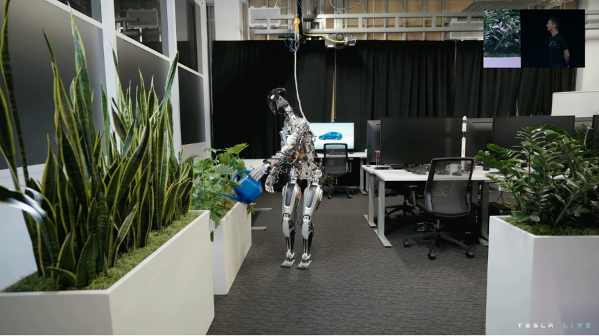 这是Optimus第一次在无人操作的情况下自主行走,特斯拉没有为它安装外壳,而是直接将内部构造呈现出来,关节、骨骼、电缆等设备清晰可见,直观展示每个动作细节。特斯拉还在视频中展现了现实中Optimus的使用场景。办公室内,它灵活地提起水壶浇花、双手搬运物料至目标位置、准确定位周围人员并主动避让。据媒体报道,特斯拉弗里蒙特工厂中Optimus已经开始投入简单工作,并为其规划了相应行动路线。