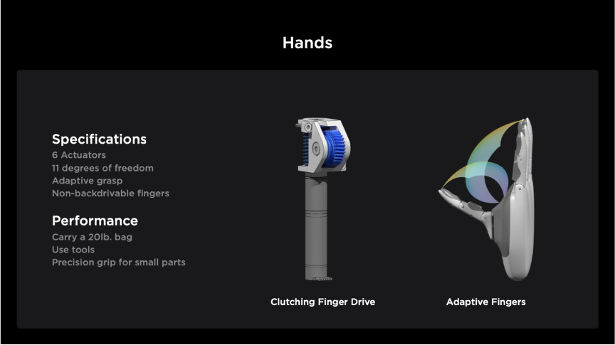 目前,Optimus已经可以完成行走、上楼梯、下蹲、拿取物体等动作,灵活的双手得益于合理的手指关节设置,柔韧性和强度表现俱佳,执行器既能够承受约半吨重的钢琴这样的重物,也可以完成轻薄物体抓取、操作机械装置、复杂手势等高精度动作。