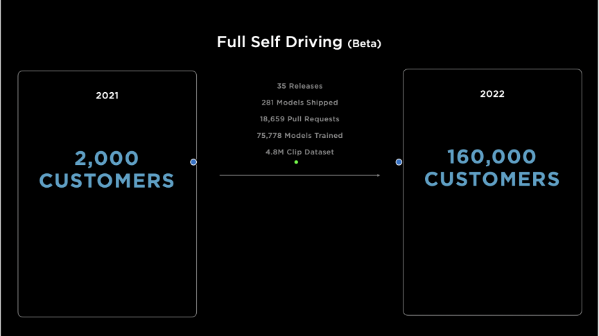 此外,特斯拉还公布了FSD(完全自动驾驶能力)和Dojo超级计算机的最新进展。目前,特斯拉已在超过16万辆车上进行了FSD Beta版系统测试,仅一年内就训练了7.5万个神经网络模型。