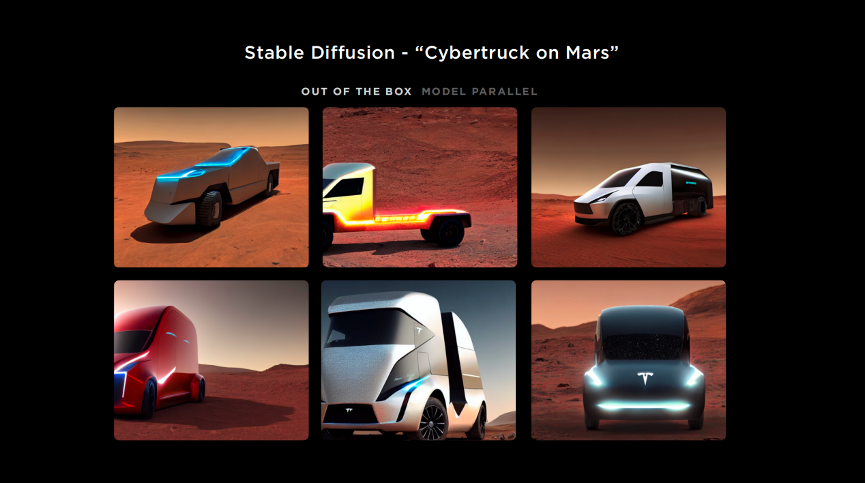 在超高算力加持下,Dojo运行“Stable Diffusion”完成如下几张图片的渲染只用了几分钟。接下来,特斯拉还将把强大渲染能力与特斯拉设计相匹配。
