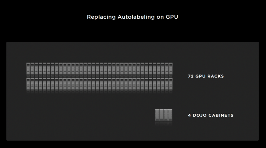 只需要4个Dojo超级计算机机柜的算力,就能实现72个GPU机柜的自动标注性能。