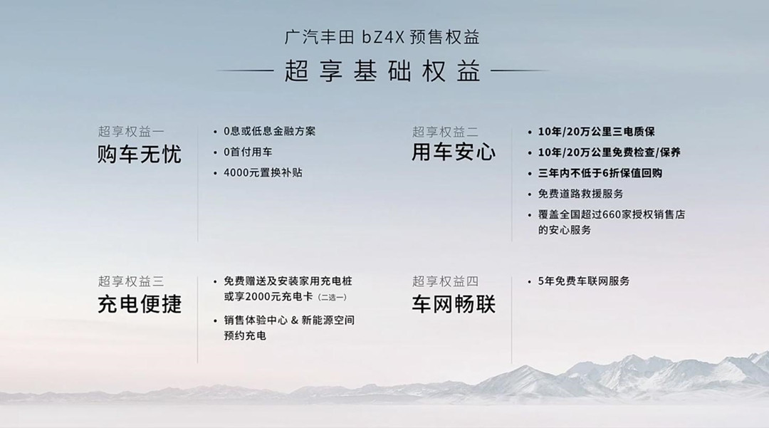 新车为用户提供了一系10年或20万公里的三电质保和免费检查/保养、三年内不低于6折保值回购、免费赠送及安装家用充电桩或享2000元充电卡、5年免费车联网服务等权益。