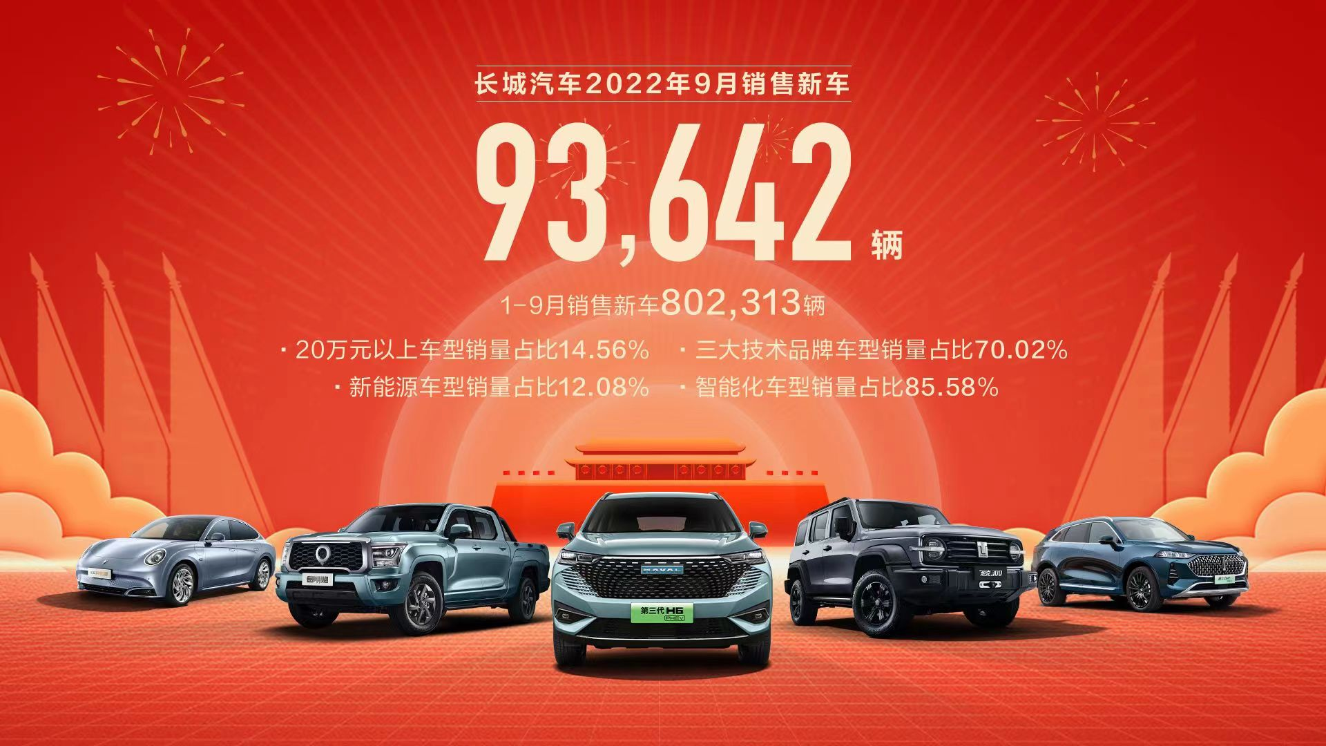 10月10日,长城汽车股份有限公司(股票代码:601633.SH,02333.HK;以下简称“长城汽车”)发布2022年9月产销数据。今年9月,长城汽车销售新车93,642辆,环比增长6.14%。其中,海外销售18,837辆,同比增长64.70%,占销量比重达20.12%;20万元以上车型销量占比提升至15.68%;新能源车型销售10,368辆,占比11.07%。