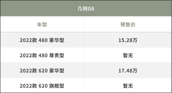 至于价格部分,目前几何G6还是预售阶段,预计10月内正式上市。已知信息参考上图就好了,其中480和620代表了车型的续航里程。