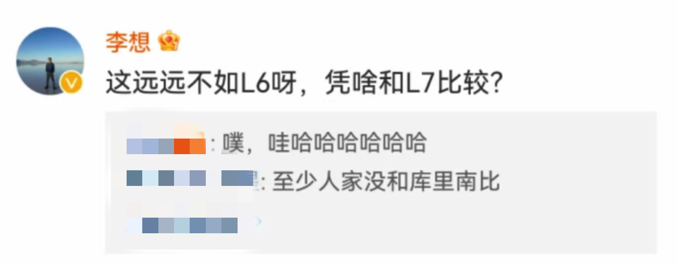 在自游家NV上市之前,理想创始人李想突然向竞品开炮,他在一篇关于自游家NV和理想L7对比的微博下评论——“这远远不如理想 L6,凭啥和 L7 比较?”