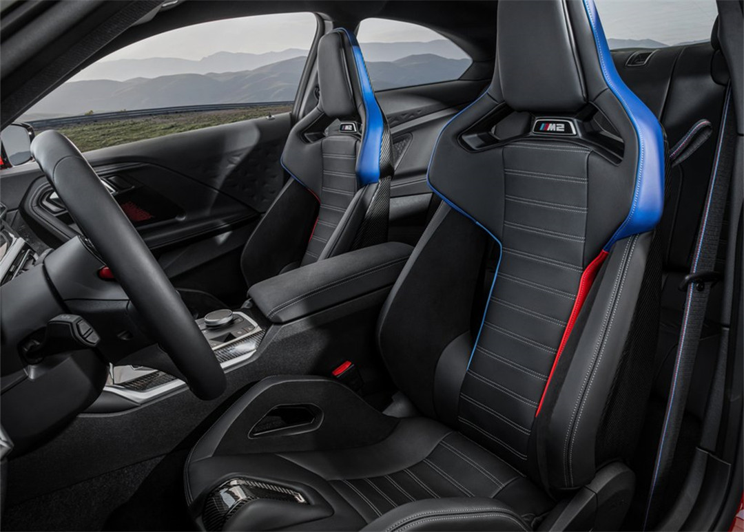 不过最显眼的还是这张需要选装的M3、M4同款镂空桶形座椅。这次新车还在门板扶手和座椅上增加了M的三色光脉饰条,属于新的设计元素。