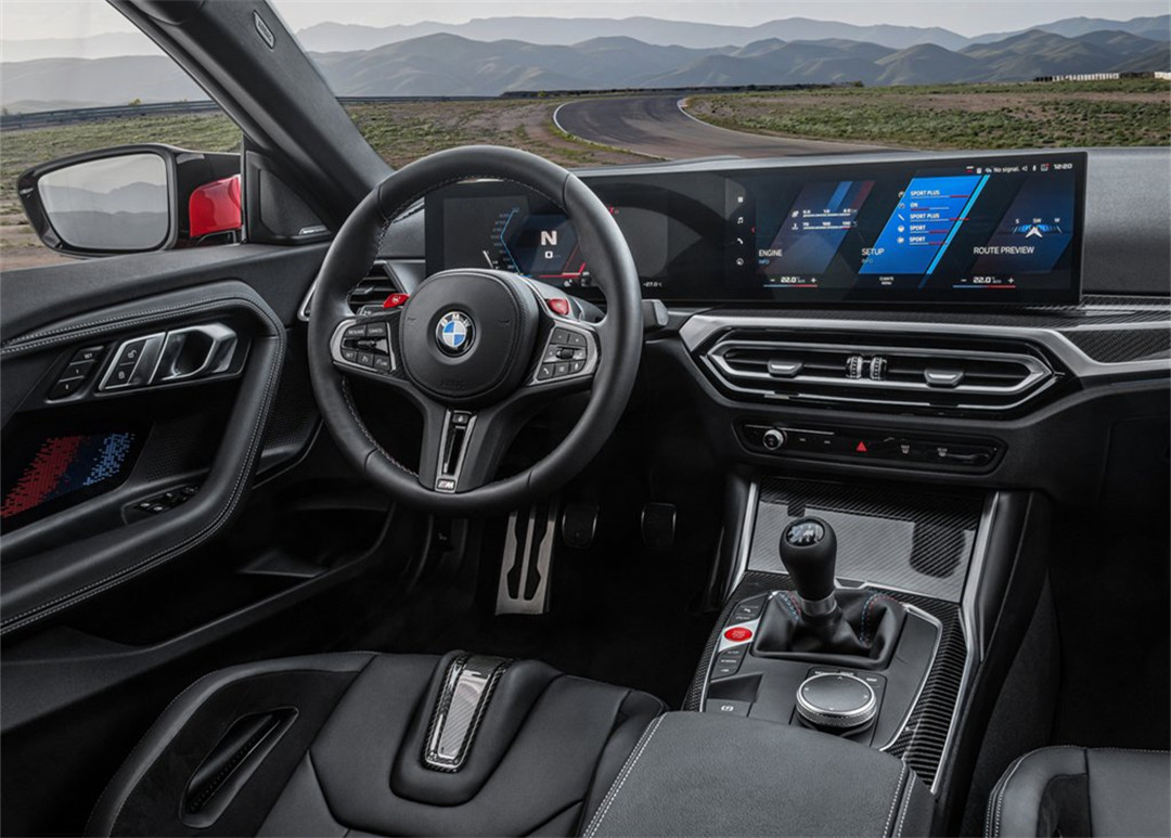 M2的内饰与M240i一样采用了宝马最新的悬浮式曲面屏,与这套设计搭配的车机是iDrive 8系统,所以跟早前发布的2系Coupe的iDrive 7内饰拉开了差距。