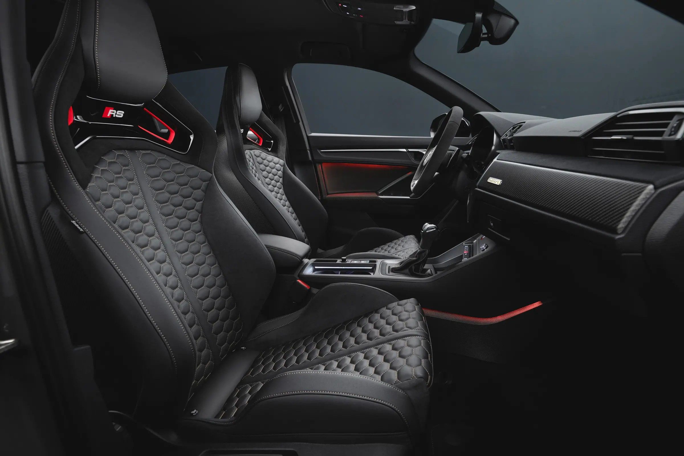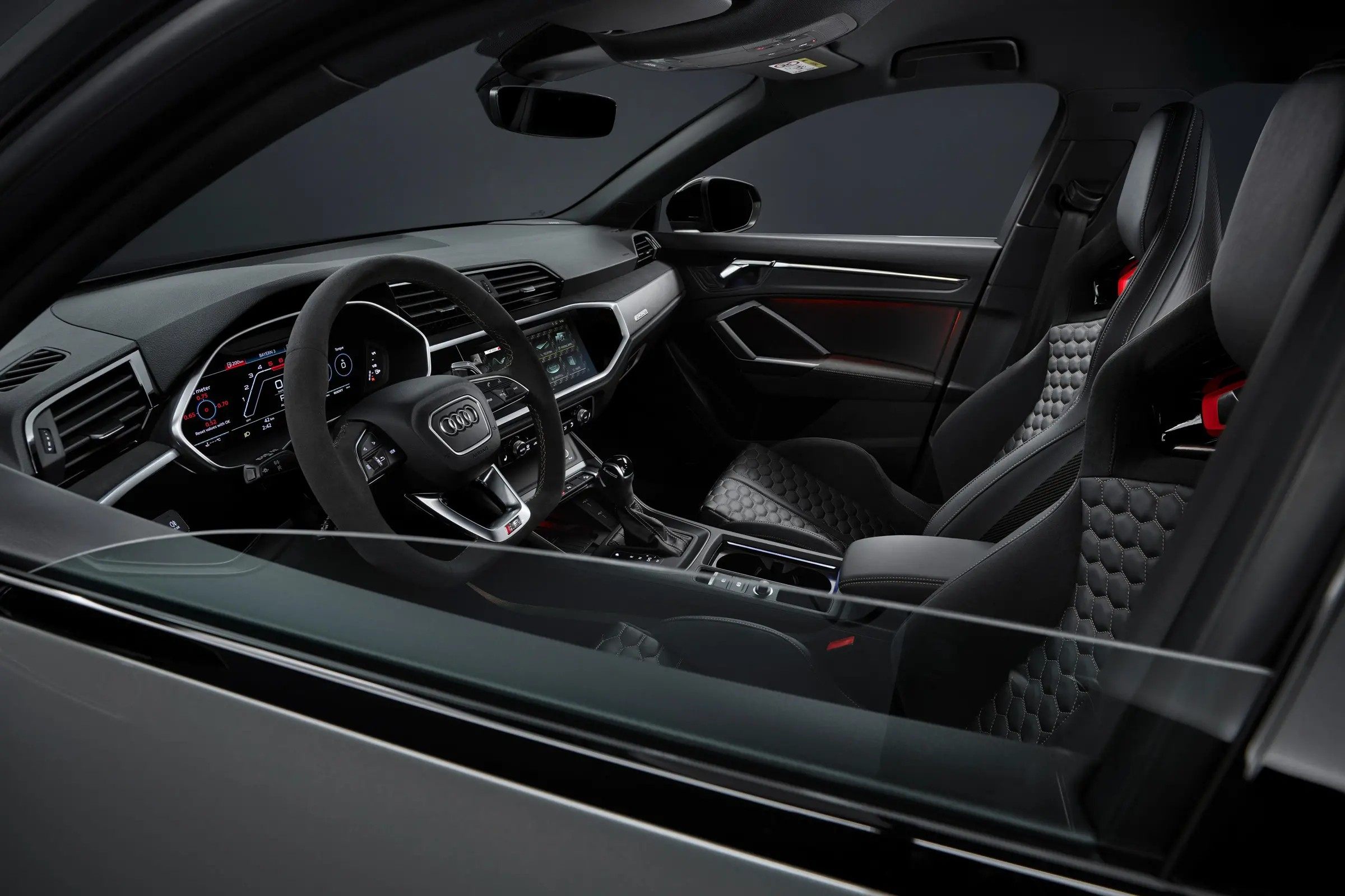 车身其他小细节也向黑武士风格靠近,后视镜、车窗边缘饰条和侧裙均变成了亮黑色,包括奥迪的四环车标也变成黑色,搭配同为红黑配色的RS标识,战斗感十分浓郁。