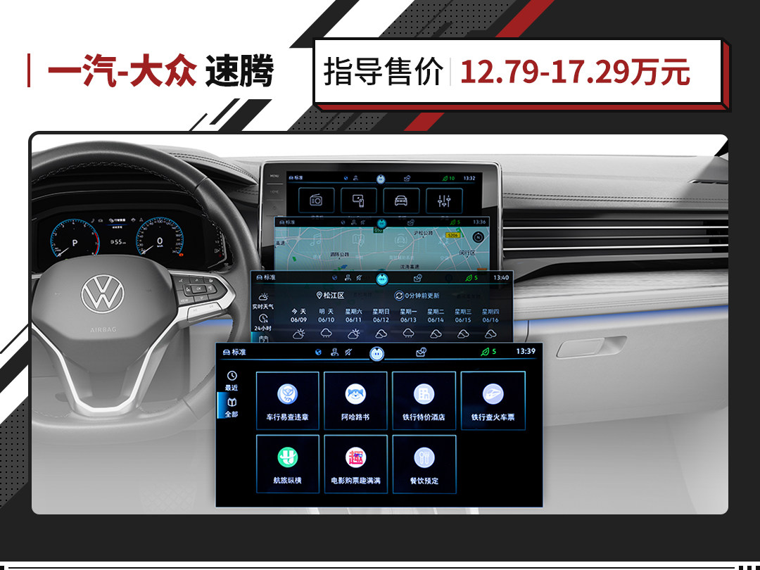 新速腾搭载10.25英寸全液晶仪表+12英寸悬浮中控屏组合,内置CNS3.0第三代信息娱乐系统,提供IQ.语音精灵和IQ.智慧车联服务,不仅功能更丰富、操作更流畅,而且双屏显示效果也得以优化,更具时尚感;比如仪表盘黑底红色边框更显运动感,中控屏内也呼应这一主题。同时,中控屏偏向驾驶员一侧,看上去更直观;另外,中控屏幕左侧还采用了触控式按键,操作更便捷。功能方面,支持Carplay/Carlife、娱乐、互联、蓝牙等主流配置,并新增了行车记录仪、电子商城、智能家居、智慧洗车、智慧加油等功能,还可以下载小程序,虽然并没有那么花哨,但可以满足日常使用。