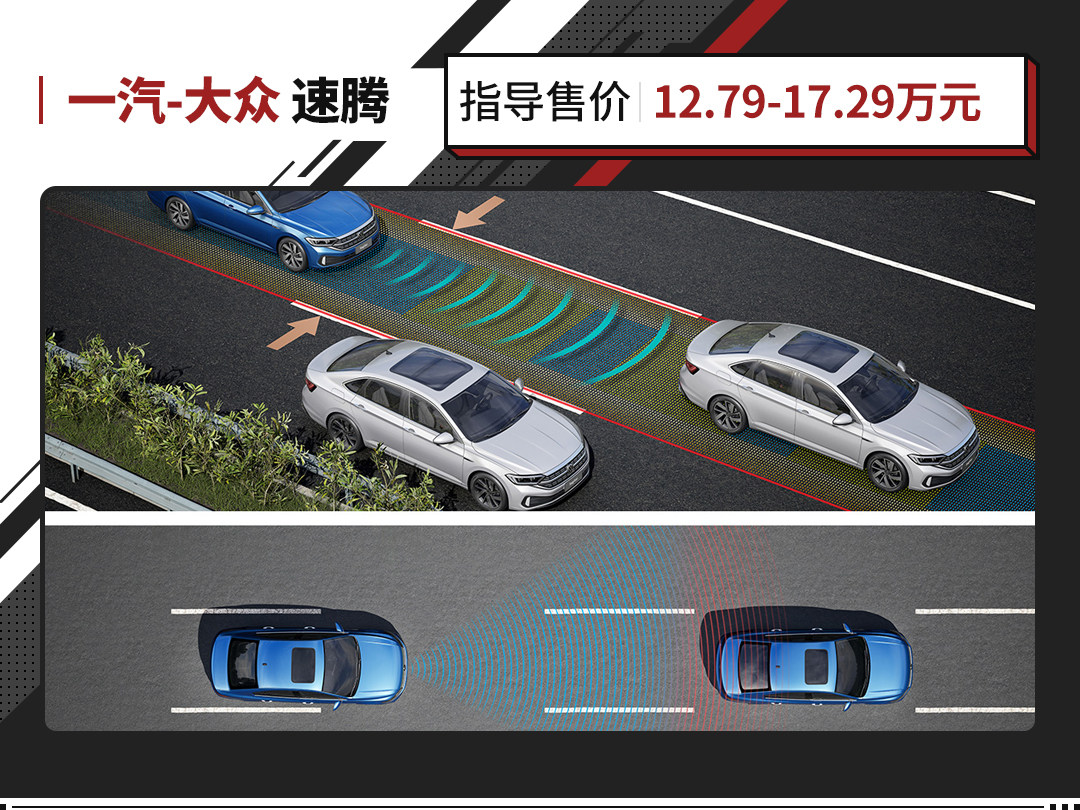 值得一提的是,新速腾在配置方面升级明显,比如全系标配倒车影像、可开启全景天窗、外后视镜电动加热等舒适性功能,更配备了IQ. Drive智驾管家,拥有ACC 3.0高级自适应巡航系统、Lane Assist车道保持系统、换道辅助SWA功能以及Front Assist与碰撞安全系统等,可实现L2级别智能驾驶辅助。