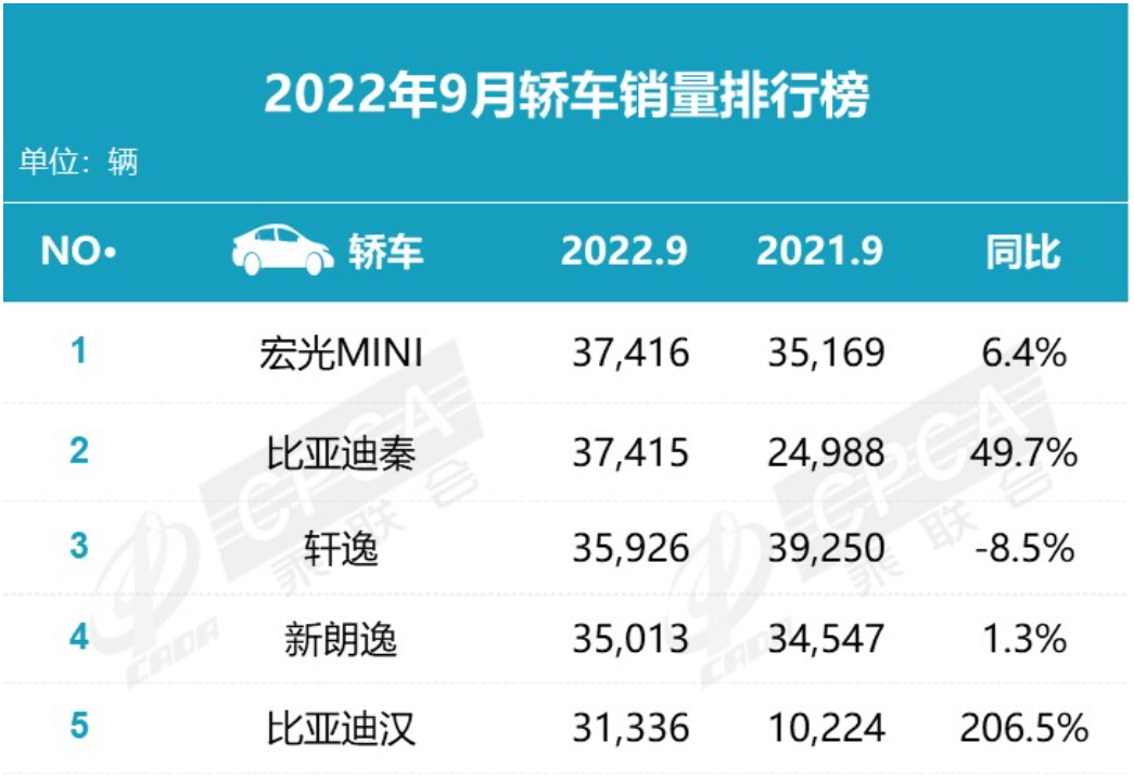 接下来,教授将为大家展开分析乘联会公布的“2022年9月轿车销量排行榜”上排名前5的车型。