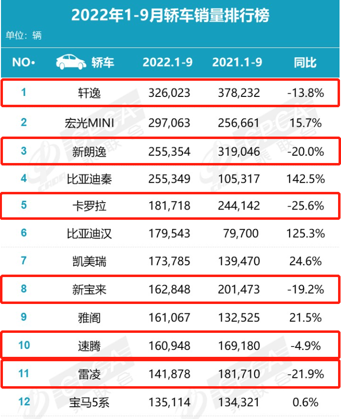 另一方面,在金九银十的汽车销售旺季,轩逸是乘联会公布的“2022年9月轿车销量排行榜”中唯一一款销量同比下滑的车型。它的江湖地位也从今年8月份的轿车销冠掉到了轿车排行榜第三名。