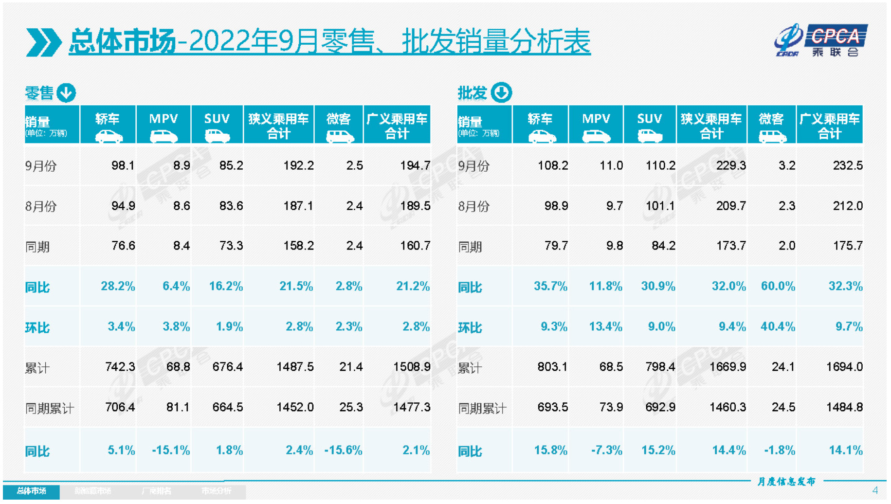 乘联会数据显示,2022年9月乘用车市场零售量达到了192.2万辆,同比增长21.5%增长速度较快。9月零售环比增长2.8%,环比增速处于近20年同期历史低位。