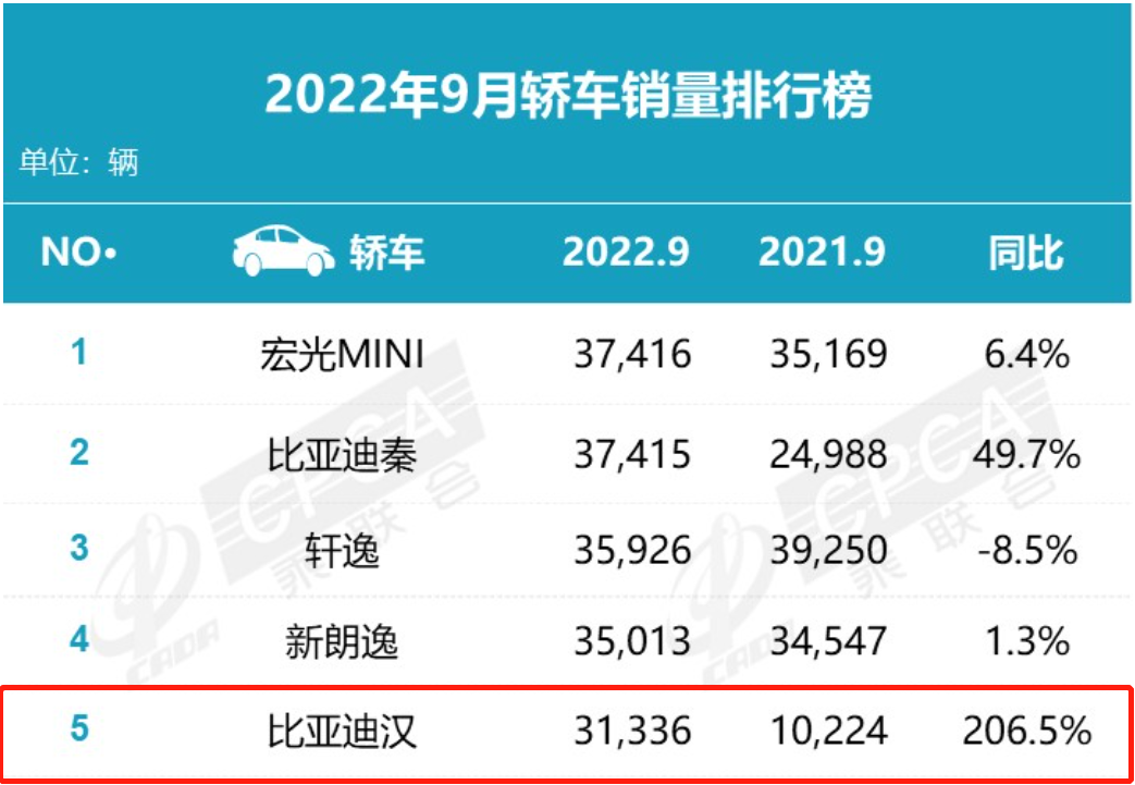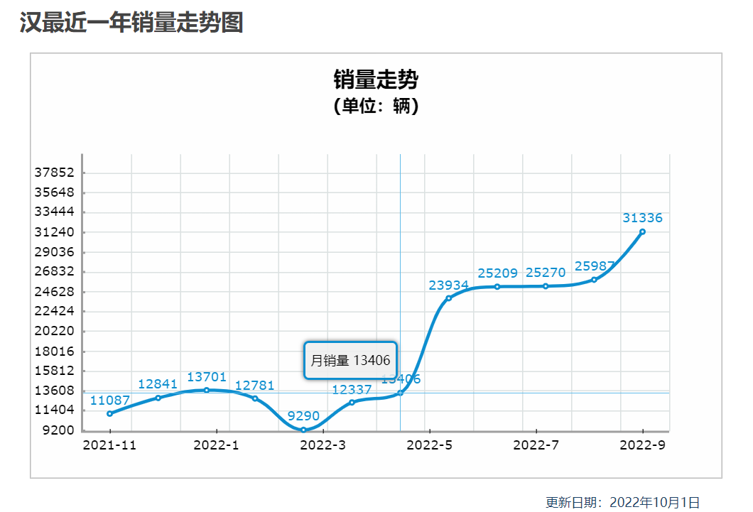 比亚迪汉作为唯一一款进入“2022年9月轿车销量排行榜”榜单的中大型轿车,也是唯一一款销量突破3万辆的中大型轿车,它凭借着31336辆的销量成绩坐上了榜单第五把交椅。